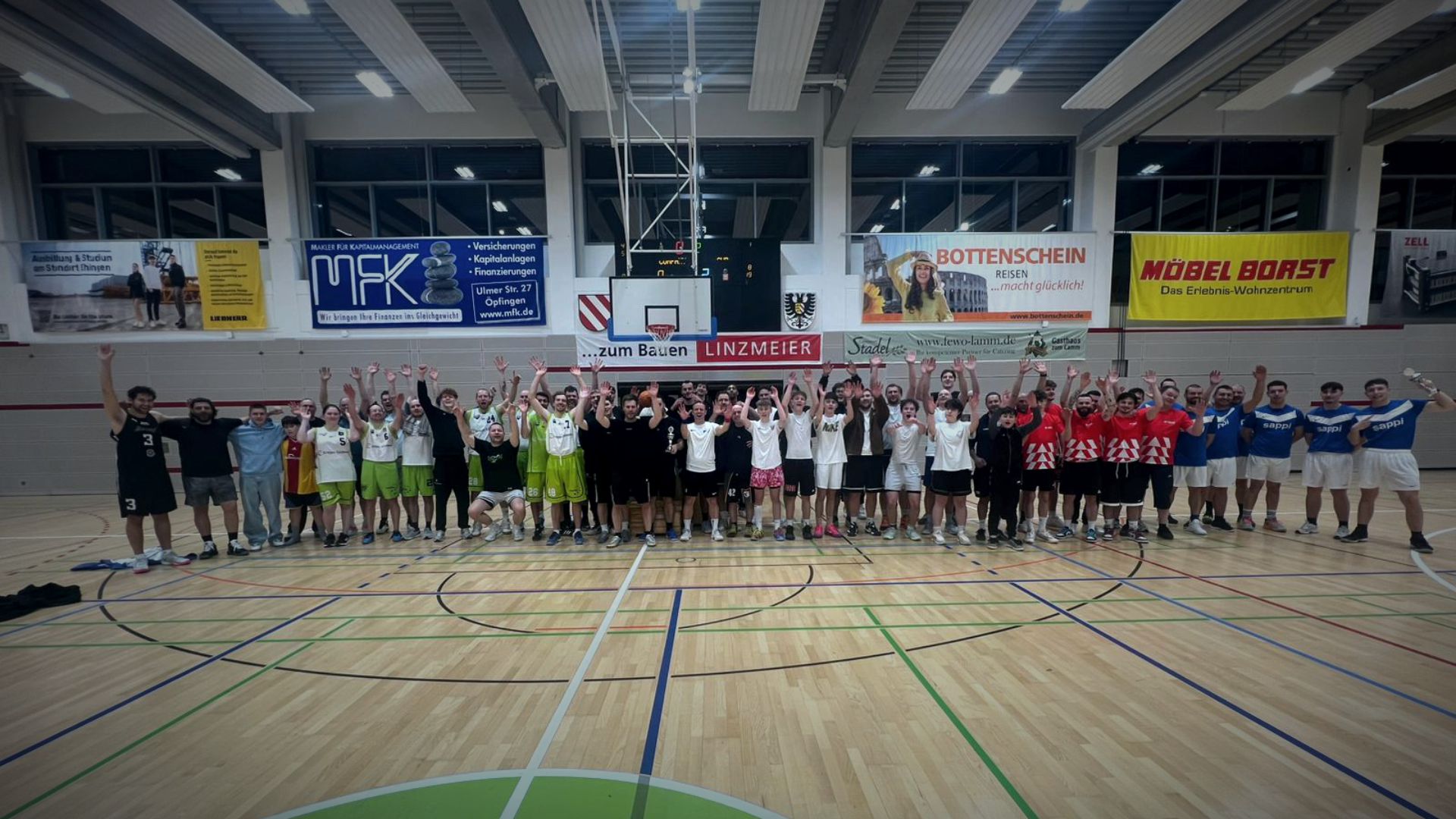Insgesamt traten 8 Mannschaften an, die zwischen 18 und 21 Uhr um die Trophäen für Platz 1-3 kämpften. Letzter Sieger wurde das „Team Vollausstattung“ vom Autohaus Ehingen, die das Spiel um Platz 7 gegen die „Flying Generators“ der Firma AVS verloren. Besser lief es beim Team von Erdgas Südwest, die ihr Platzierungsspiel gegen die „Urspring Lakers“, ein Mix aus Lehrern, Mentoren und weiteren Mitarbeiter*innen der Urspringschule, für sich entscheiden konnten und damit auf Platz 5 landeten. Auf dem undankbaren 4. Platz aber trotzdem mit guter Laune und einem schönen Abend landete „LBE“, die Auswahl des Liebherr Werks Ehingen, die sich im Spiel um Platz drei vg media geschlagen geben mussten. Knapp im Finale unterlegen waren die starken „Hungry Lions“ (Sappi) um Ex-TEU-Manager Merlin Stamm. Damit feiern die Coaches des Kooperationspartners TSG Ehingen bereits das zweite Jahr in Folge den Titel beim AOK Company Cup. Herzlichen Glückwunsch!